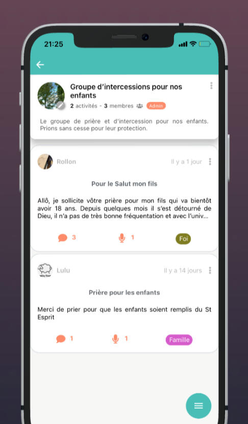 Crée ton propre groupe de prière et rassemble ceux qui te sont proches.Invite tes amis, ta famille ou ton église à partager des sujets et à prier ensemble pour vos enfants, vos pasteurs, vos défis ou tout autre sujet qui te tient à cœur.